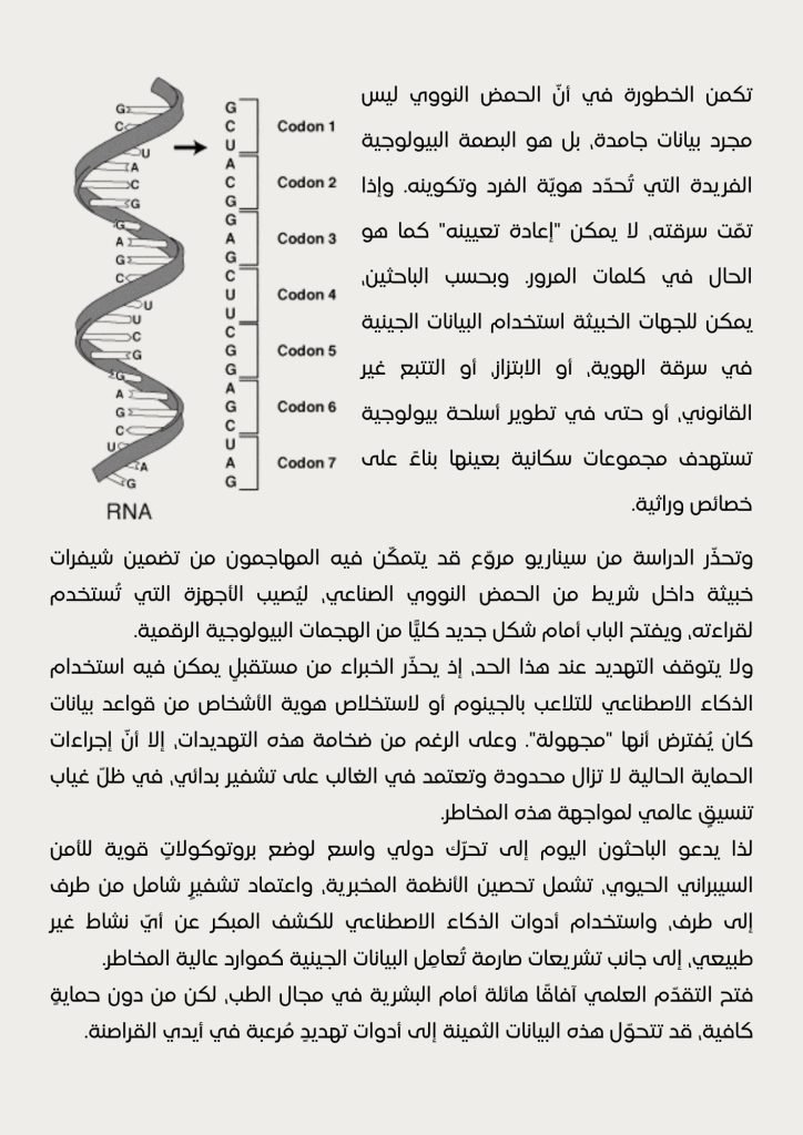 وتحذّر الدراسة من سيناريو مروّع قد يتمكّن فيه المهاجمون من تضمين شيفرات خبيثة داخل شريط من الحمض النووي الصناعي، ليُصيب الأجهزة التي تُستخدم لقراءته، ويفتح الباب أمام شكل جديد كليًّا من الهجمات البيولوجية الرقمية.
