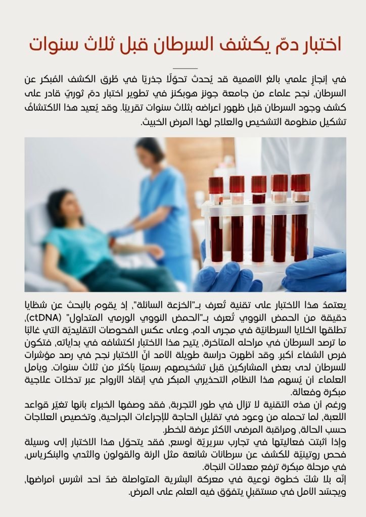 في إنجازٍ علمي بالغ الأهمية قد يُحدث تحوّلًا جذريًا في طُرق الكشف المُبكر عن السرطان، نجح علماء من جامعة جونز هوبكنز في تطوير اختبار دمّ ثوريّ قادر على كشف وجود السرطان قبل ظهور أعراضه بثلاث سنوات تقريبًا. وقد يُعيد هذا الاكتشافُ تشكيل منظومة التشخيص والعلاج لهذا المرض الخبيث.