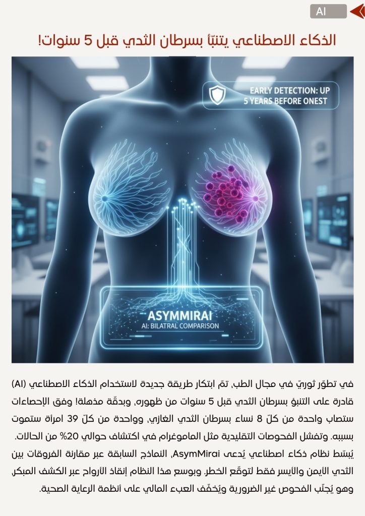 في تطوّر ثوريّ في مجال الطب، تمّ ابتكار طريقة جديدة لاستخدام الذكاء الاصطناعي (AI) قادرة على التنبؤ بسرطان الثدي قبل 5 سنوات من ظهوره، وبدقّة مذهلة! وفق الإحصاءات ستصاب واحدة من كلّ 8 نساء بسرطان الثدي الغازي، وواحدة من كلّ 39 امرأة ستموت بسببه. وتفشل الفحوصات التقليدية مثل الماموغرام في اكتشاف حوالي 20% من الحالات.