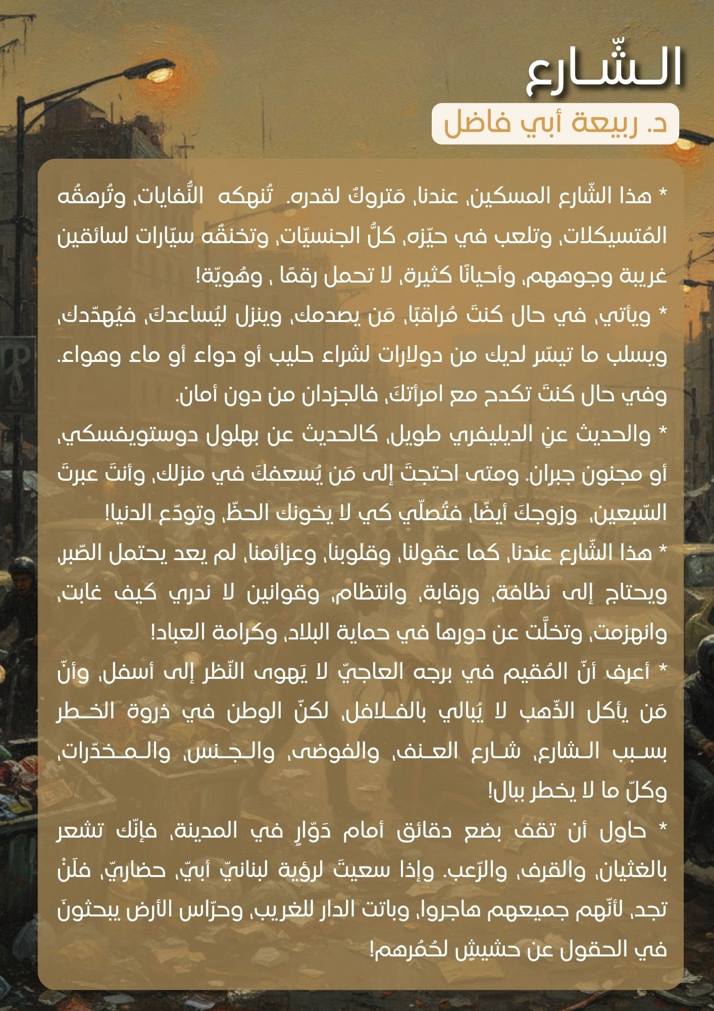* هذا الشّارع المسكين، عندنا، مَتروكٌ لقدره. تُنهكه النُّفايات، وتُرهقُه المُتسيكلات، وتلعب في حيّزه، كلُّ الجنسيّات، وتخنقٌه سيّارات لسائقين غريبة وجوههم، وأحيانًا كثيرة، لا تحمل رقمًا ، وهُويّة!