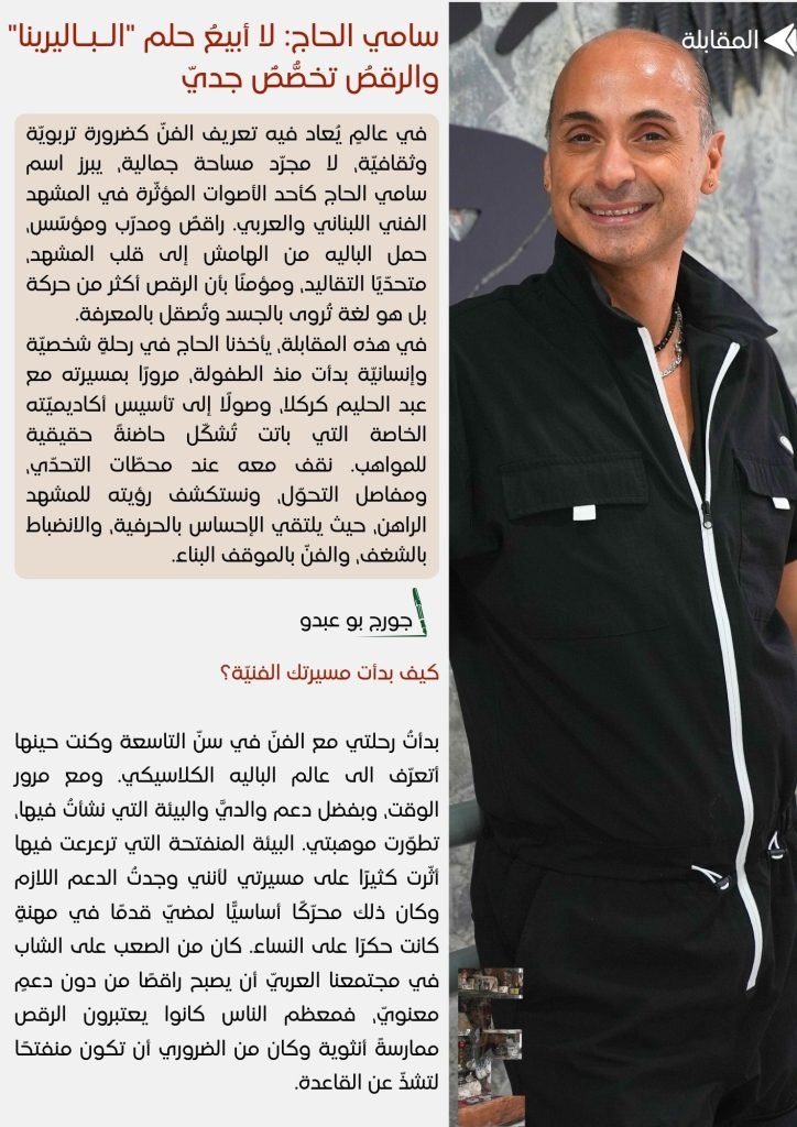 في عالمٍ يُعاد فيه تعريف الفنّ كضرورة تربويّة وثقافيّة، لا مجرّد مساحة جمالية، يبرز اسم سامي الحاج كأحد الأصوات المؤثّرة في المشهد الفني اللبناني والعربي. راقصٌ ومدرّب ومؤسّس، حمل الباليه من الهامش إلى قلب المشهد، متحدّيًا التقاليد، ومؤمنًا بأن الرقص أكثر من حركة بل هو لغة تُروى بالجسد وتُصقل بالمعرفة.