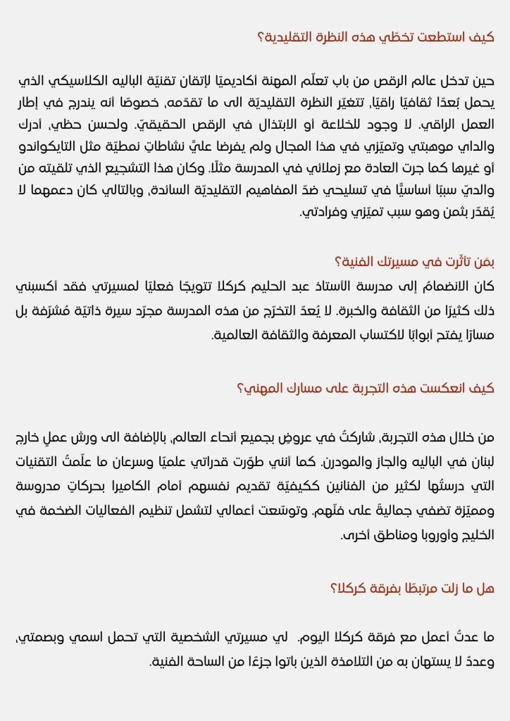 ما عدتُ أعمل مع فرقة كركلا اليوم. لي مسيرتي الشخصية التي تحمل اسمي وبصمتي، وعددٌ لا يستهان به من التلامذة الذين باتوا جزءًا من الساحة الفنية.