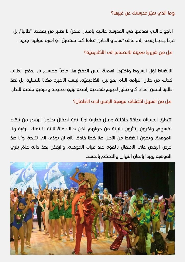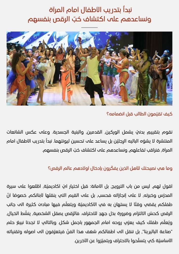 أقول لهم، ليس من باب الترويج، بل الأمانة: قبل اختيار أيّ أكاديميّة، اطّلعوا على سيرة المدرّس وخبرته، لا على إنجازاته فحسب، بل على القيم التي ينقلها لأبنائكم، خصوصًا أنّ طفلكم يقضي وقتًا لا يستهان به في الأكاديميّة ويتعلّم فيها مبادئ كثيرة الى جانب الرقص كحسّ الالتزام وضرورة بذل جهدٍ للاحتراف. فالرّقص يصقل الشخصية، ينشّط الخيال، ويُعلّم طفلك كيف يعرّي روحه أمام الجمهور بأجمل شكل. وبالتالي لا تجدنا نبيعُ حلم “صناعة الباليرينا”، بل ننقل الى أطفالكم شغف هذا الفنّ فيتعرّفون الى أصوله وتقنياته الأساسيّة كي يتسلّحوا بالاحتراف ويتميّزوا عن الآخرين.
