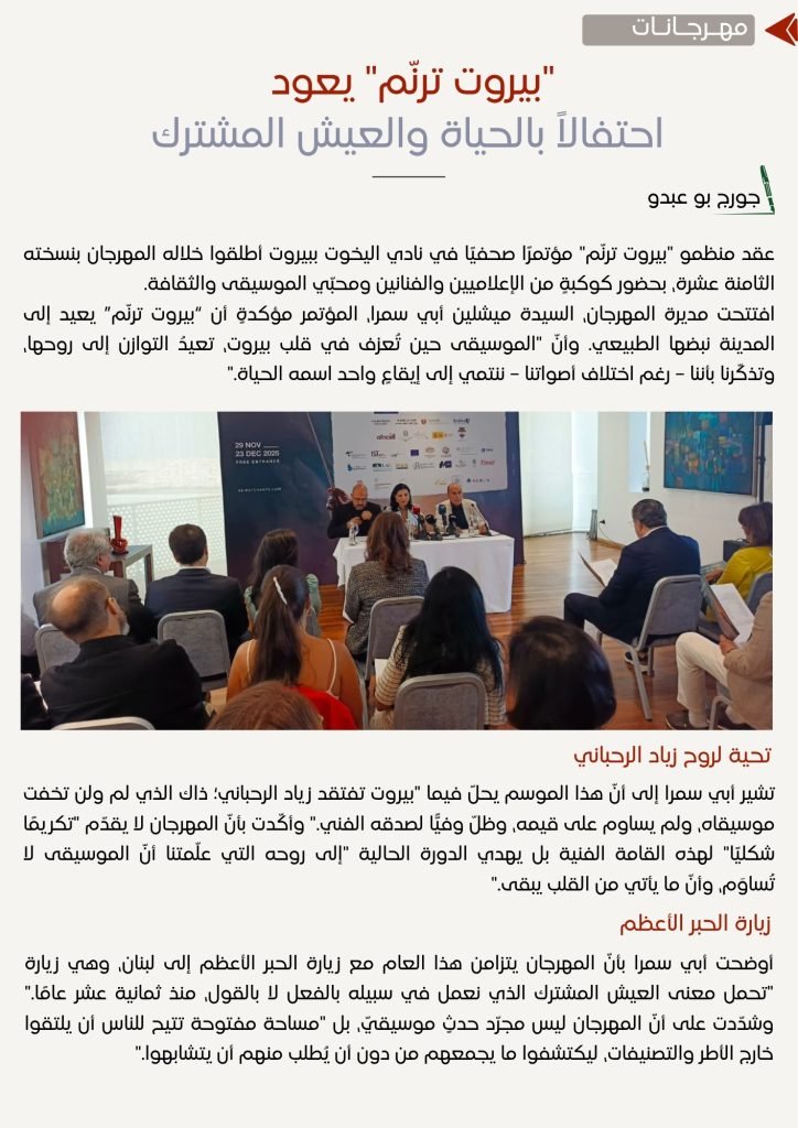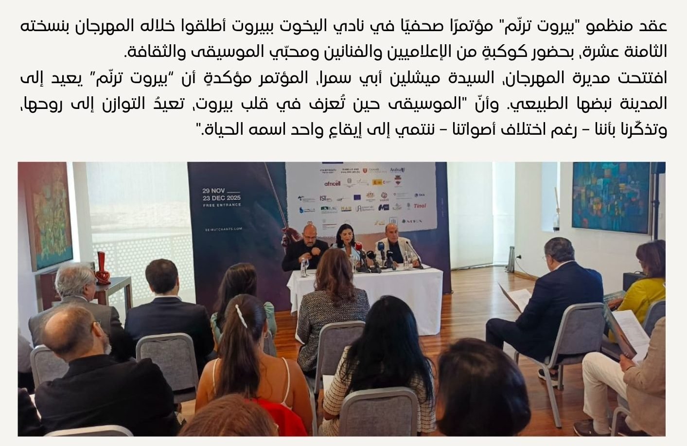 عقد منظمو “بيروت ترنّم” مؤتمرًا صحفيًا في نادي اليخوت ببيروت أطلقوا خلاله المهرجان بنسخته الثامنة عشرة، بحضور كوكبةٍ من الإعلاميين والفنانين ومحبّي الموسيقى والثقافة.