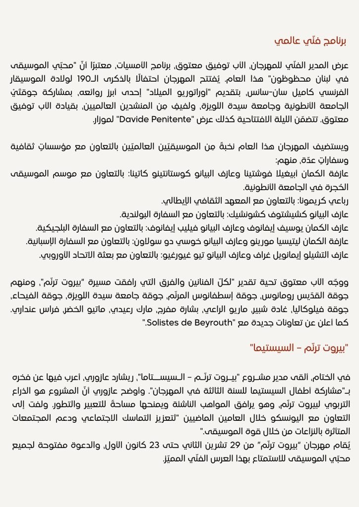 ووجّه الأب معتوق تحية تقدير “لكلّ الفنانين والفرق التي رافقت مسيرة “بيروت ترنّم”، ومنهم جوقة القدّيس رومانوس، جوقة إسطفانوس المرنّم، جوقة جامعة سيدة اللويزة، جوقة الفيحاء، جوقة فيلوكاليا، غادة شبير، ماريو الراعي، بشارة مفرج، مارك رعيدي، ماتيو الخضر، فراس عنداري. كما أعلن عن تعاونات جديدة مع “Solistes de Beyrouth.”